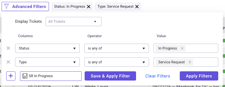 A Ticket List Filter can be saved for repeated use. Enter your search query, then select the save button to enter a name for the search, then select Save & Apply Filter.