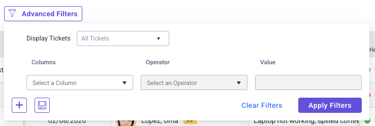 The Ticket List Filter allows the ability to quickly search and find what you are looking for. Filter by any available column in the Ticket List, select an operator and enter or select a value to complete your query. The Ticket List Filter also allows for complex filtering by adding additional queries to the search.