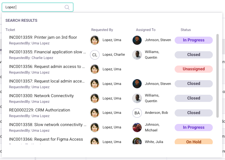 The results for a quick search are displayed by the most likely result first. Each result displays the Ticket Number, Short Description, Requested By, Assigned To, Status and a hint to which fields the search matched on. The more matches the higher the result will appear.