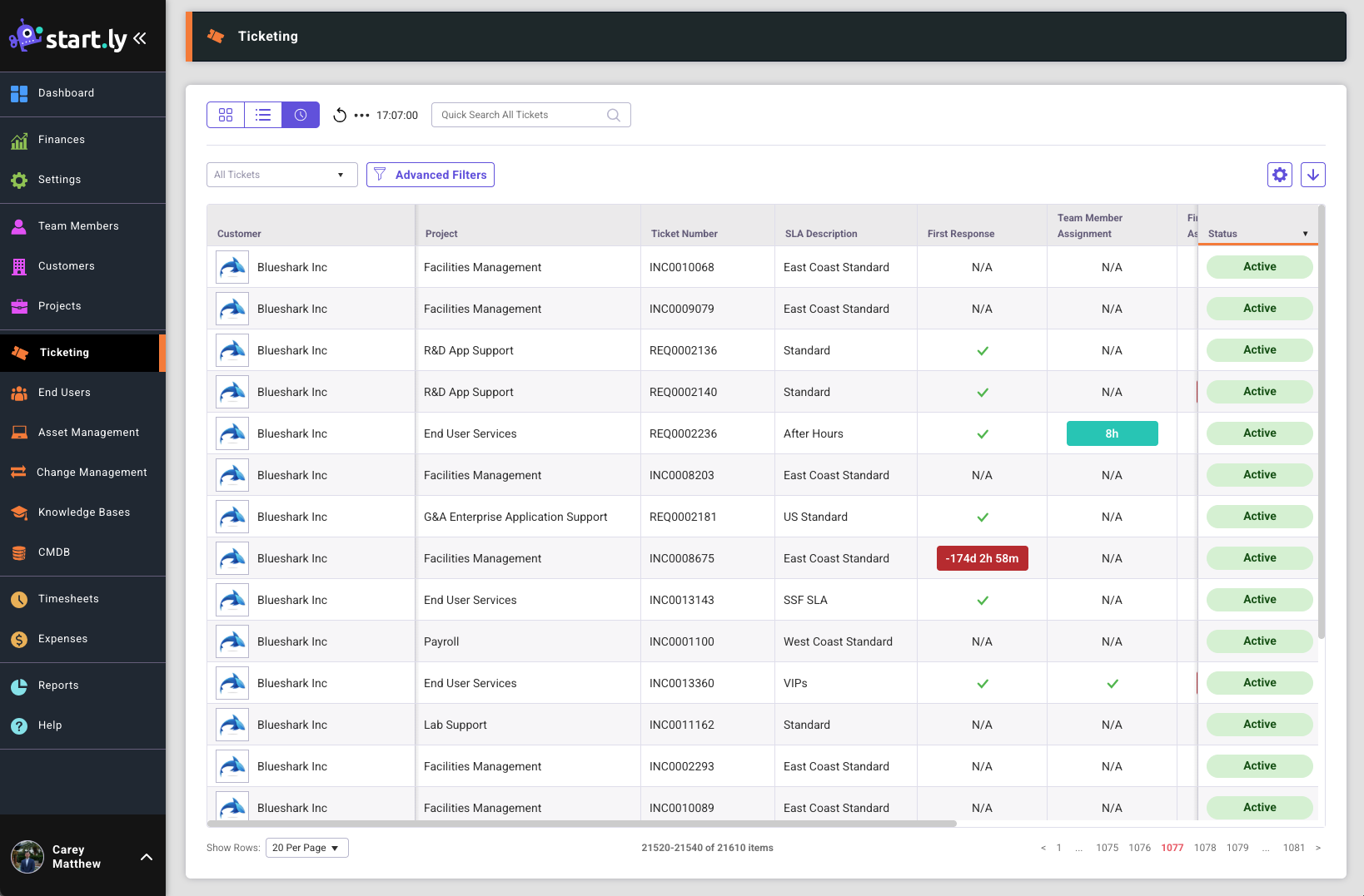 - Search, filter and sort SLAs for all tickets in the system