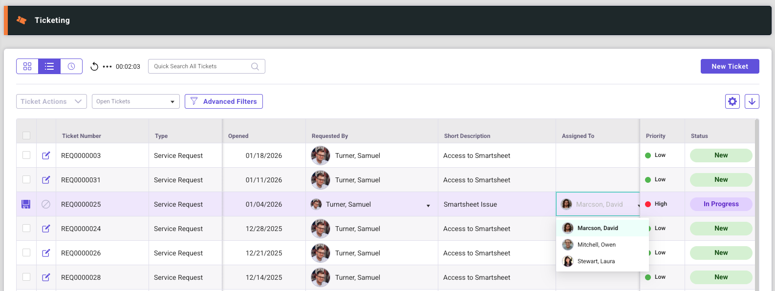 Inline editing provides a quick and convenient way to update common ticket fields directly from the list without navigating away from the page.