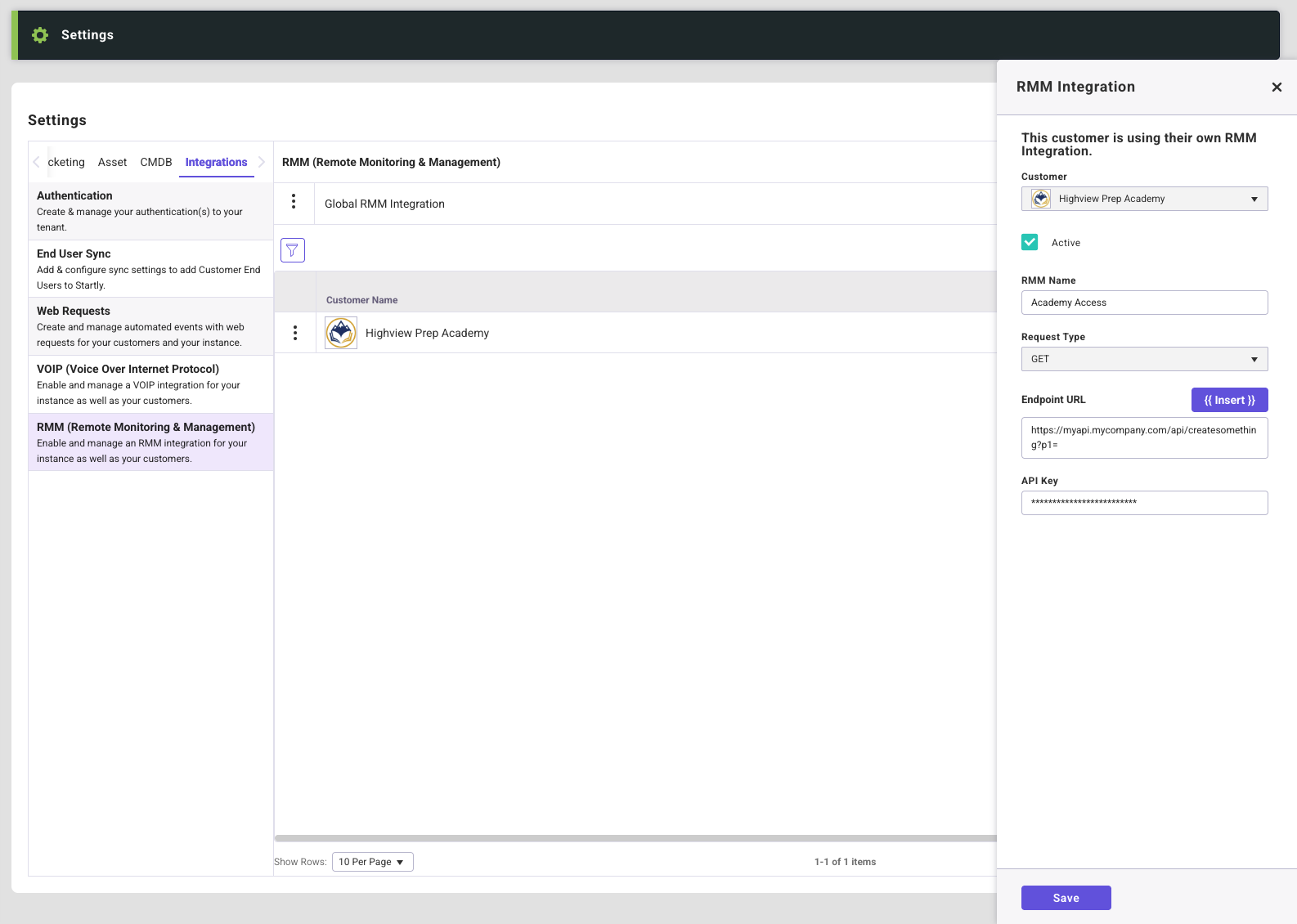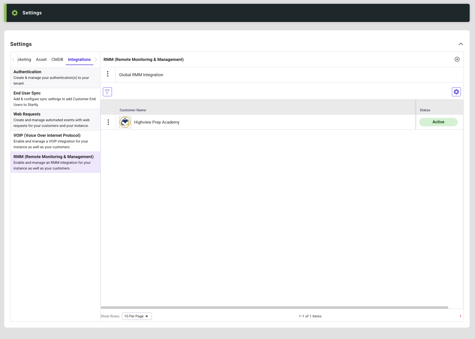 The RMM settings in Startly enable teams to configure remote access integrations for managing and supporting devices directly from within the platform. A global RMM configuration can be established to serve as the default across the entire Startly instance, ensuring consistent access for all customers. For greater flexibility, individual customers can also have their own dedicated RMM integrations, which will override the global configuration when present. Each integration is securely connected using an endpoint URL and API key, allowing teams to seamlessly initiate remote sessions and streamline device support workflows.