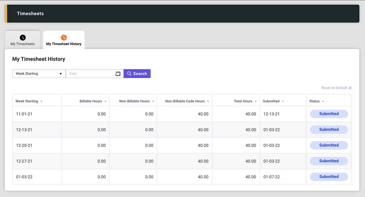 The My Timesheet History tab displays the historical list of all of your timesheets. You can select any week to review that timesheet.